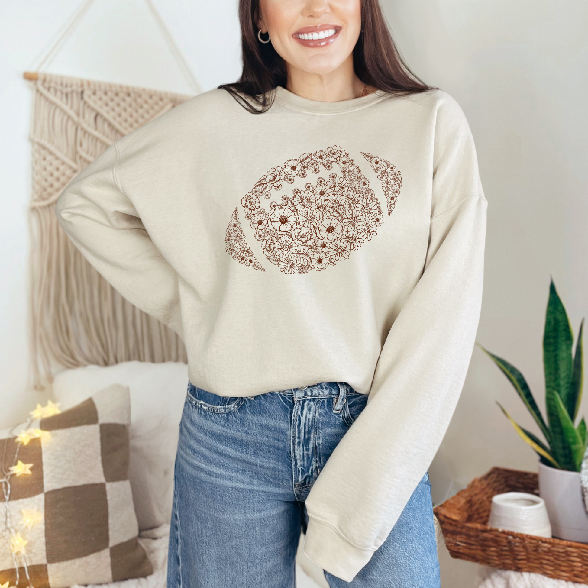 Bring a touch of feminine charm to game day with our Floral Football Sweatshirt. Featuring a unique football design made of delicate floral patterns, this cozy crewneck is perfect for football fans who love a stylish twist. Made with soft, durable fabric, it’s great for tailgates, game nights, or lounging in comfort.