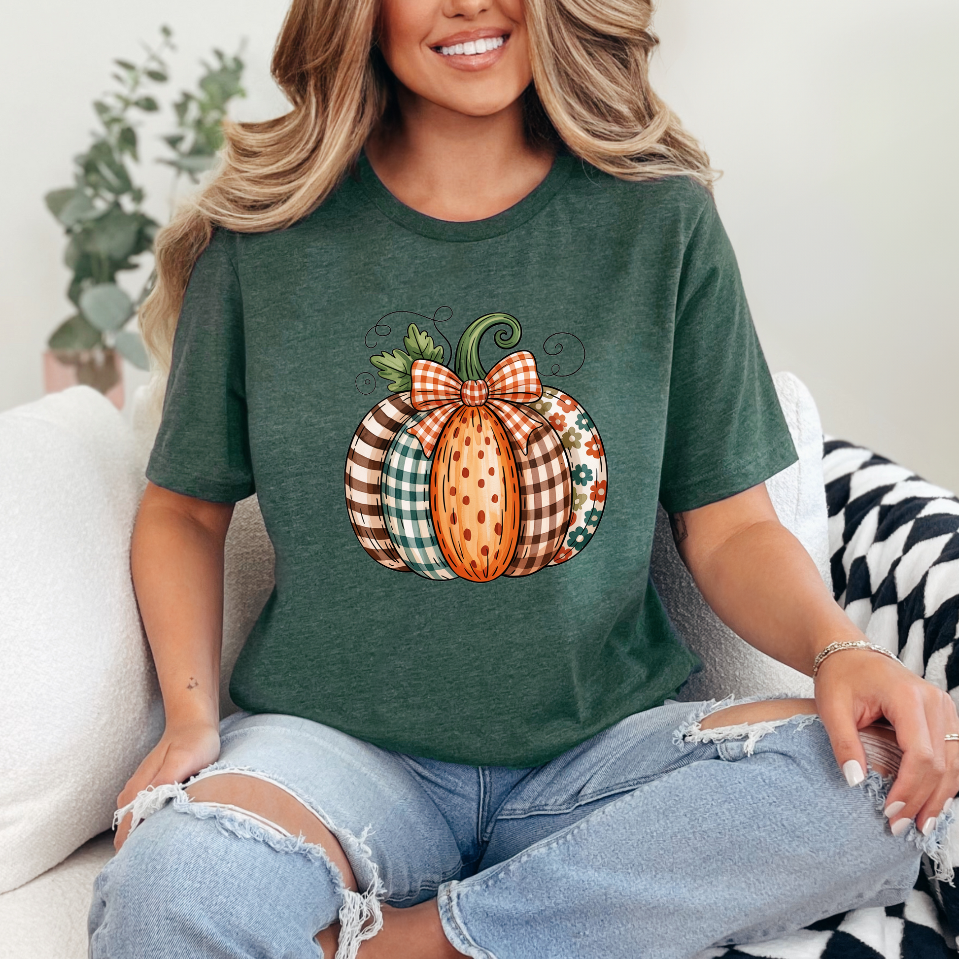 This cute fall pumpkin graphic tee features a mix of plaid, polka dots, and florals, topped with a bow for the perfect cozy-season vibe. Made with soft, breathable fabric for everyday comfort, it’s the perfect autumn essential for pumpkin patch trips, coffee runs, or relaxing at home.